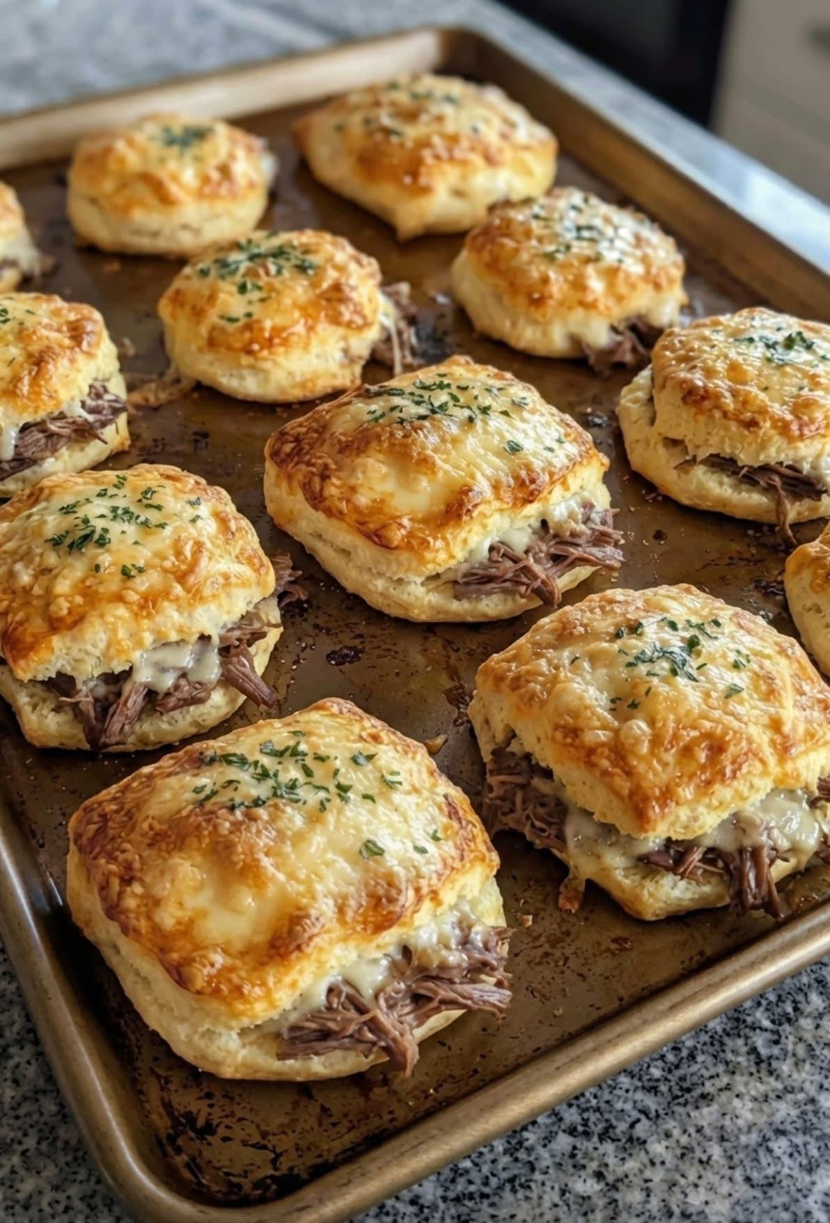 French Dip Biscuits Recipe – These flaky refrigerated biscuits are filled with tender roast beef, melted provolone, and a kick of horseradish, then baked to perfection. When they come out of the oven, brush them with melted butter for an extra layer of flavor. Serve with hot au jus on the side for dipping—absolutely delicious! Perfect for parties, tailgating, or a simple lunch or dinner. These always disappear fast!