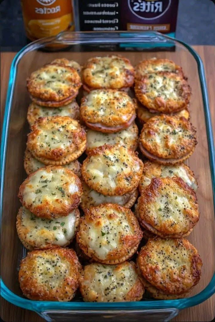 Okay these Ritz Cracker Party Sandwiches are to die for!! They are a cracker version of everyone’s favorite ham sliders. Ham and swiss tucked between two Ritz crackers and then topped with a worcestershire, mustard, butter, onion powder, poppy seed mixture before getting baked in the oven. These are seriously the best appetizer I have ever had!