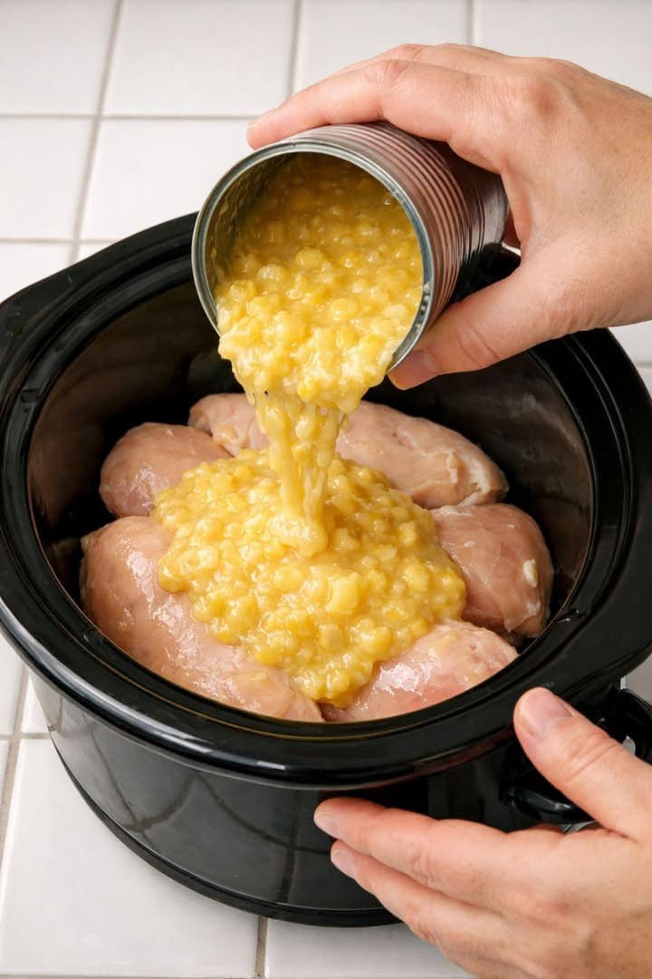 2. Add Corn: Open the cans of cream style corn and dump them evenly over the chicken breasts, spreading the corn so the chicken is mostly covered.